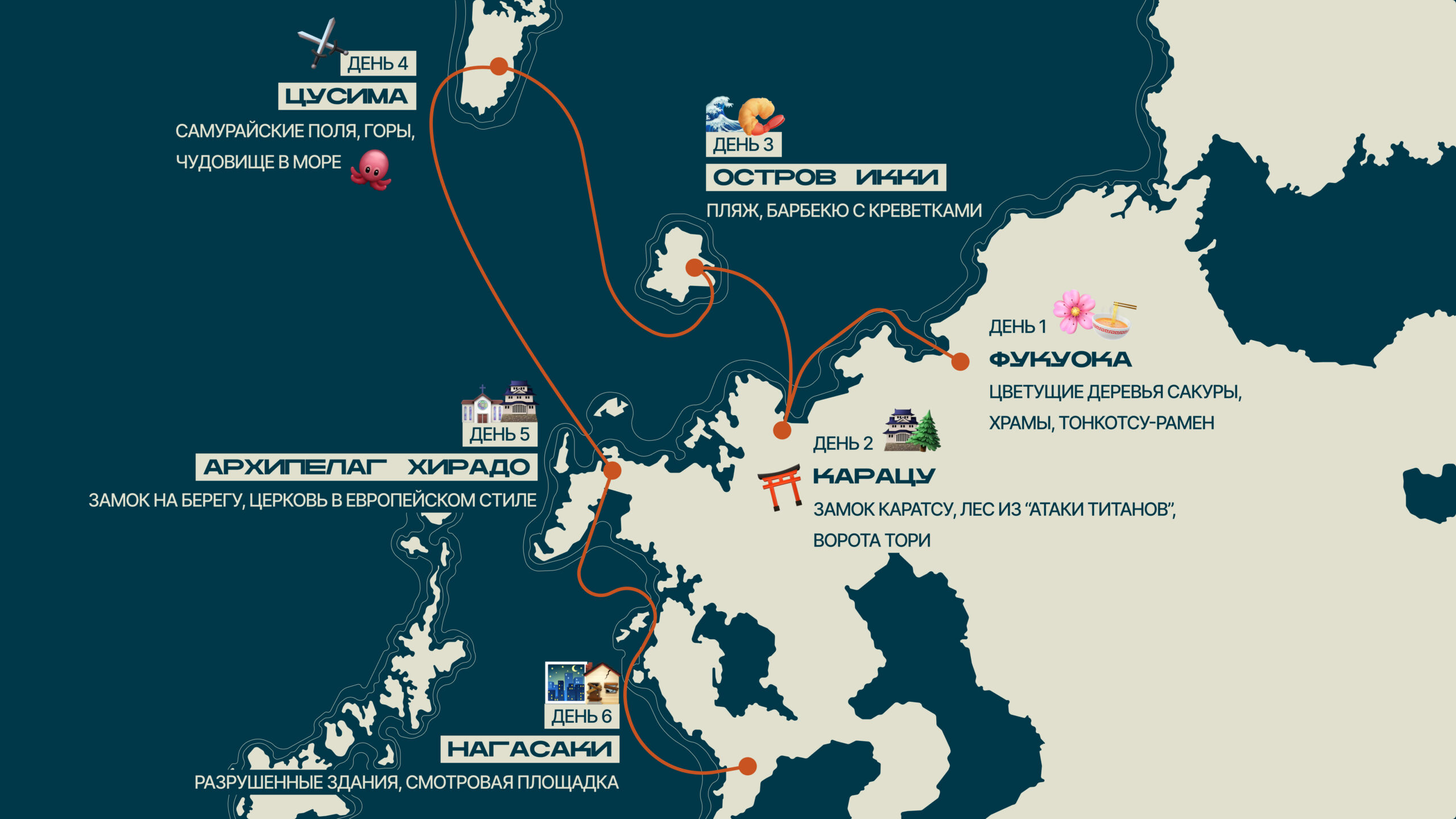 Вечером попробуем знаменитый тонкоцу рамен — гордость Фукуоки, а после расслабимся в горячих источниках, наслаждаясь тишиной и покоем. Это идеальное начало нашего приключения.